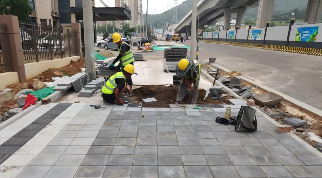 (图为人行道铺装施工现场)