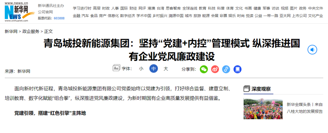 近日,新华网刊发了青岛城投新能源集团党风廉政建设工作优秀成果,以下为报道原文: