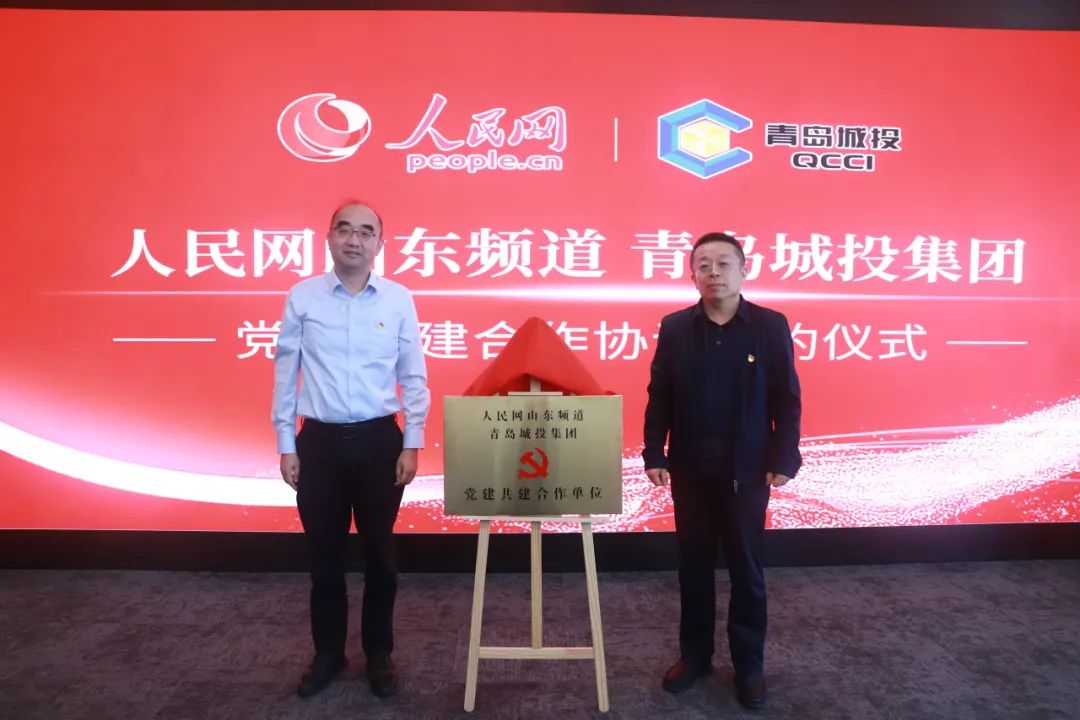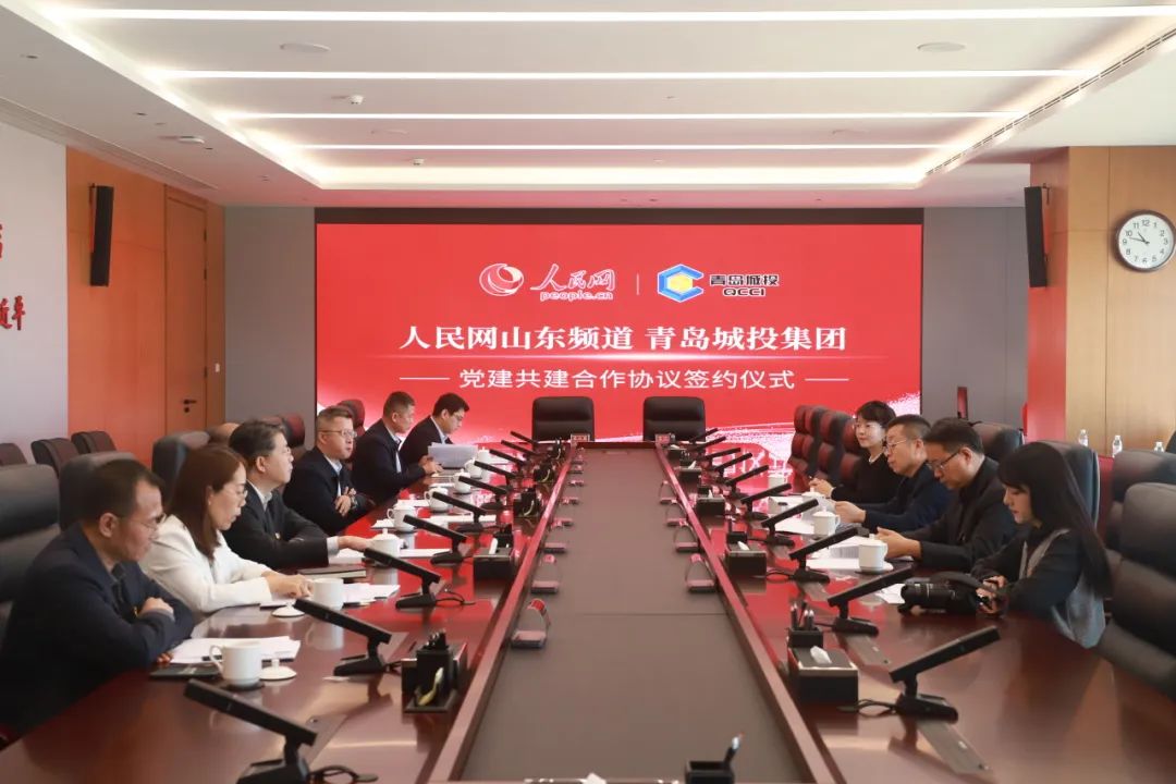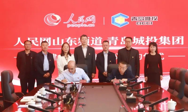 人民网股份有限公司山东分公司总经理邢强,青岛市委宣传部正局级领导干部管习会,青岛市国资委党委副书记、副主任于剑,城投集团党委书记、董事长李蔚,城投集团党委委员、纪委书记冷严冰出席仪式见证签约。