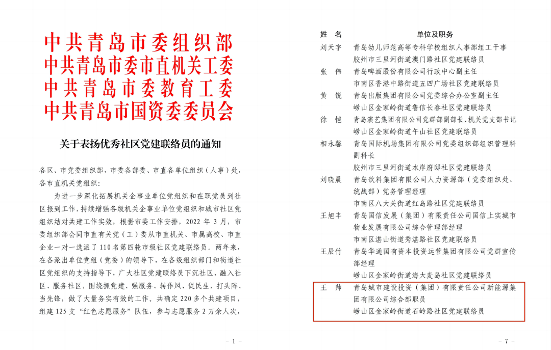 近日,市委组织部、市直机关工委、市委教育工委、市国资委四部门联合行文《开云app官方在线入口表扬优秀社区党建联络员的通知》对青岛城投新能源集团王帅同志等55名优秀社区党建联络员进行了表彰。2022年以来,城投集团与金家岭街道石岭路社区开展党建结对共建“双报到”,本次表彰再次体现了有关部门对集团党建共建工作的高度评价。