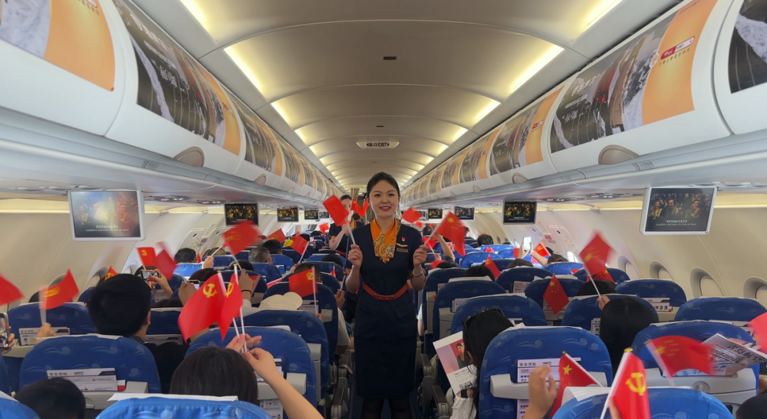青岛航空公司党委在QW9807南昌-西双版纳航班上举办“铭记光辉历史传承红色基因”主题航班活动。航班上,旅客们积极参与党史知识竞答,分享入党初心和成长故事,并在贺卡上写下对党和祖国的祝福。乘务员与旅客共同挥舞手中的党旗和国旗,齐唱《没有共产党就没有新中国》,在万米高空共同庆祝中国共产党成立104周年,打造了一场别开生面的“空中红色之旅”。