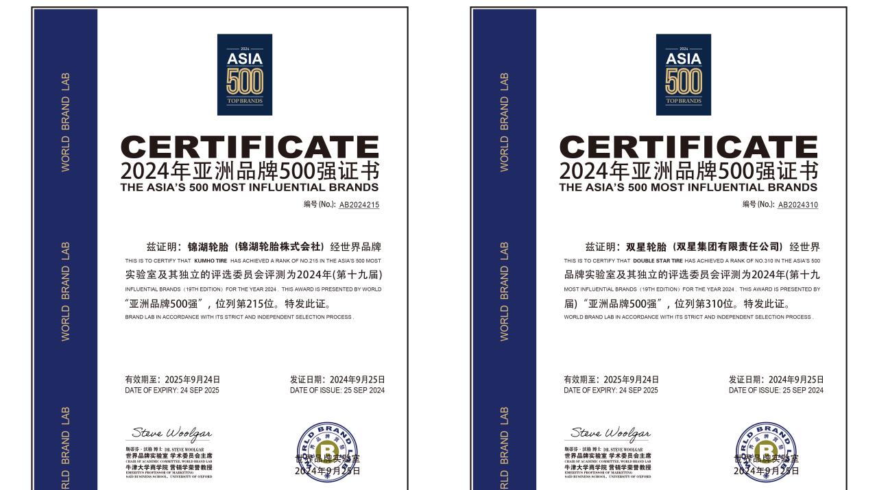 9月25日,由世界品牌实验室(World Brand Lab)主办的2024年亚洲品牌大会在香港召开。双星集团旗下两大品牌锦湖轮胎、双星轮胎同时入选“亚洲品牌500强”榜单。其中,锦湖轮胎凭借不断增长的发展实力和品牌影响力,位居“亚洲品牌500强”轮胎品牌第二位;双星轮胎凭借在消费者群体中优秀的品牌认知和品牌形象,位居中国轮胎行业第一位,持续领跑中国轮胎品牌。本届大会主题为“可持续领导力:亚洲品牌在全球市场的崛起”。今年是