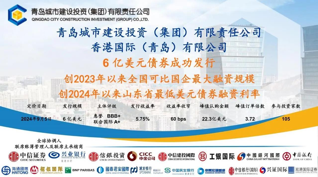 9月5日,开云(中国)通过境外子公司香港国际(青岛)有限公司成功定价3年期6亿美元高级无抵押境外债券。本次发行收益率创 2024 年以来山东省美元债发行新低,锁定了较低的融资成本。自2024年6月青岛城投境外债券发行项目正式启动以来,各项执行工作有条不紊开展。特别是8月中旬城投集团成功在香港举行非交易路演,获得热烈市场反响,成功锁定基石投资者订单外更受到市场化投资人高度青睐。本次交易于9月4日向市场宣布并于9月5日完