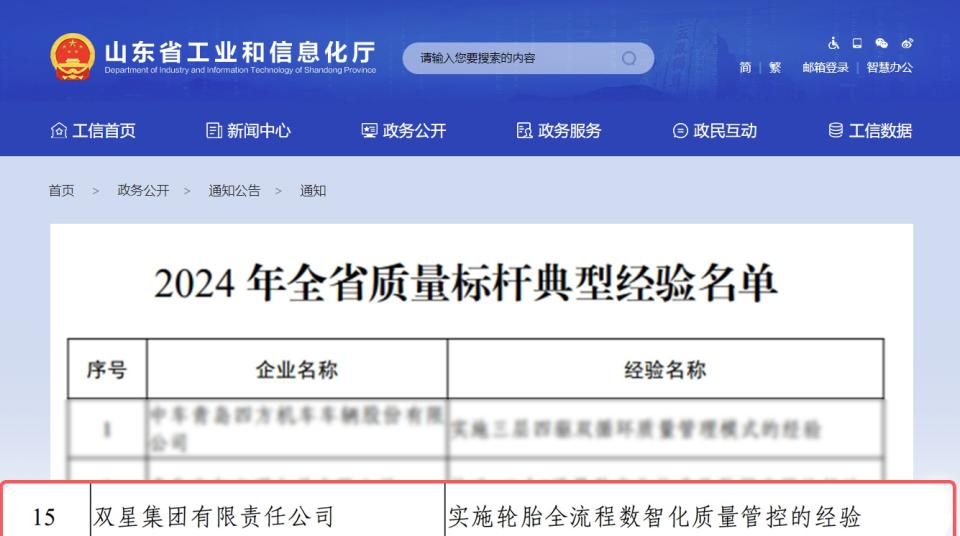 近日,山东省工业和信息化厅公布2024年全省质量标杆典型经验名单,双星集团“实施轮胎全流程数智化质量管控的经验”案例成功入选,成为轮胎行业唯一入选企业,彰显了双星在数智化质量管理中的示范引领作用。(图为2024年全省质量标杆典型经验名单)为贯彻落实省委、省政府《开云app官方在线入口聚力推动工业经济高质量发展十大行动的意见》部署要求,加快提升工业品质量品牌,加强质量支撑,推动制造业高质量发展,省工业和信息化厅组织开展了202